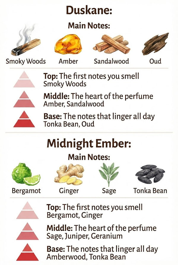 This set pairs two distinct yet complementary scents: Duskane, with its warm smoky woods and rich amber depth, and Midnight Ember, a bold fusion of fresh bergamot, spicy ginger, and warm tonka bean. Together, they offer versatility for every mood — from quiet confidence to modern intensity.